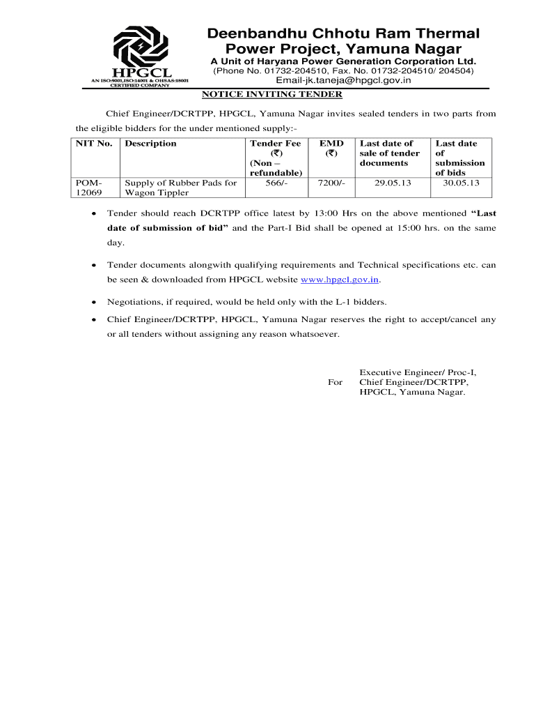 Deenbandhu Chou Ram Thermal Power Project, Fauna Nagar A Unit of Haryana Power Generation Corporation Ltd. (Phone No. 01732204510, Fax. No. 01732204510/ 204504) Email. Tanja HPGL.gov.in NOTICE INVITING