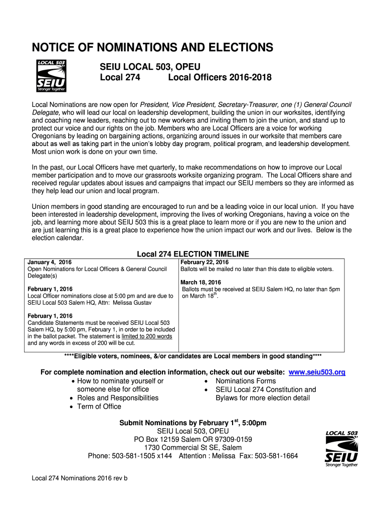 Get the free NOTICE OF NOMINATIONS AND ELECTIONS - seiu503org