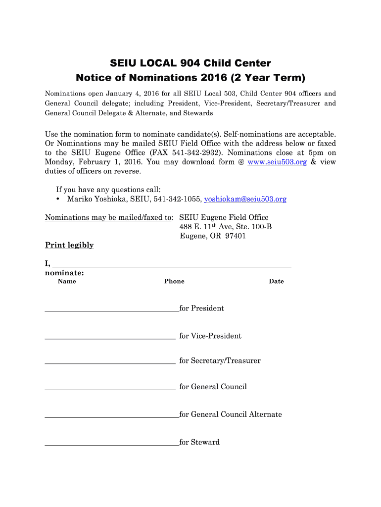 SEU LOCAL 904 Child Center Notice of Nominations 2016 (2 Year Term) Nominations open January 4, 2016, for all SEU Local 503, Child Center 904 officers and General Council delegate; including President,