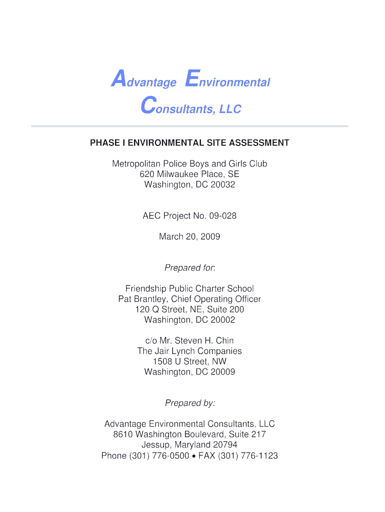 Advantage Environmental Consultants, LLC PHASE I ENVIRONMENTAL SITE ASSESSMENT Metropolitan Police Boys and Girls Club 620 Milwaukee Place, SE Washington, DC 20032 AEC Project No. 09028 March 20,