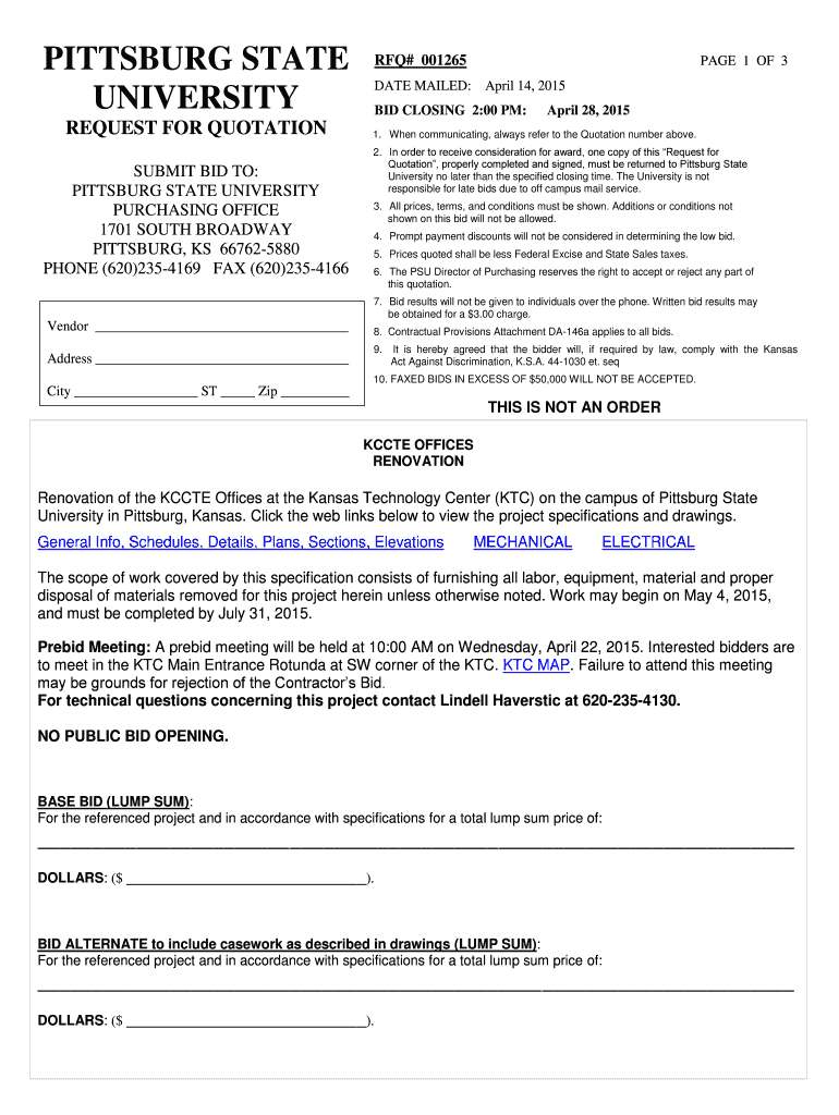 PITTSBURGH STATE UNIVERSITY REQUEST FOR QUOTATION SUBMIT BID TO: PITTSBURGH STATE UNIVERSITY PURCHASING OFFICE 1701 SOUTH BROADWAY PITTSBURGH, KS 667625880 PHONE (620)2354169 FAX (620)2354166 RFQ#