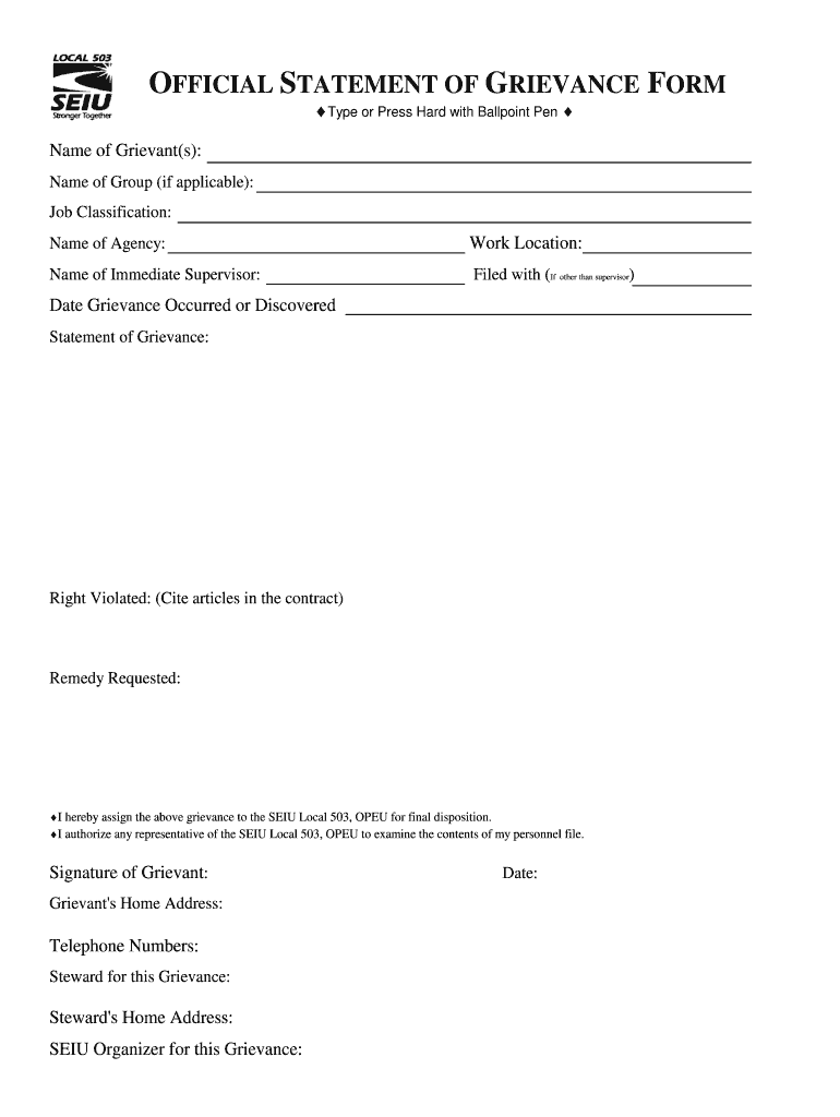 Get the free O STATEMENT OF GRIEVANCE FORM - local109 seiu503