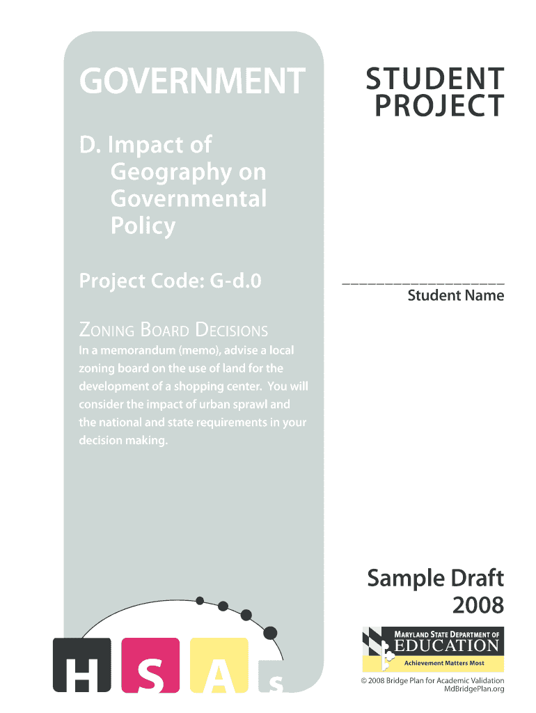 GOVERNMENT Student project D. Impact of Geography on Governmental Policy Project Code: Gd.0 Student Name Zoning Board Decisions In a memorandum (memo), advise a local zoning board on the use of land