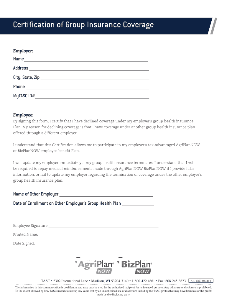 Certification of Group Insurance Coverage Employer: Name Address City, State, Zip Phone Myths ID# Employee: By signing this form, I certify that I have declined coverage under my employers group health