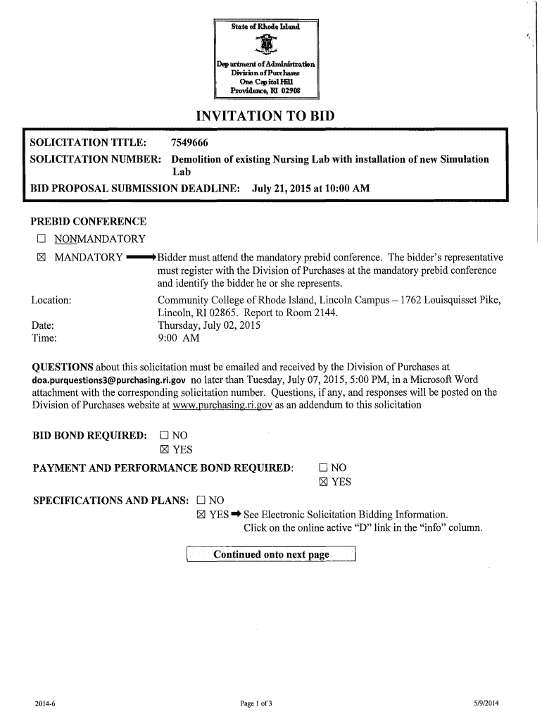 State of Rhode Island 1. Apartment ofAdminiriration Division of Purchases One ClIJlitolHill Provident:e, m 02908 INVITATION TO BID SOLICITATION TITLE: 7549666 SOLICITATION NUMBER: Demolition of existing