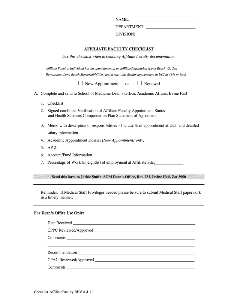 NAME: DEPARTMENT: DIVISION: AFFILIATE FACULTY CHECKLIST Use this checklist when assembling Affiliate Faculty documentation. Affiliate Faculty: Individual has an appointment at an affiliated institution