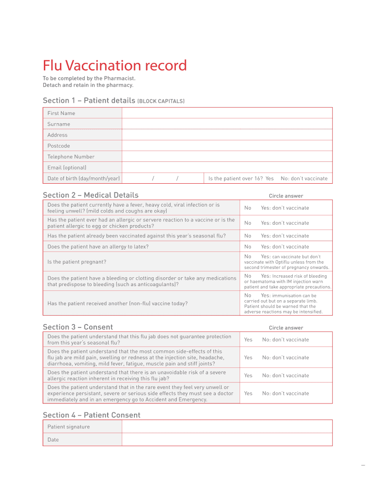 Flu Vaccination Program Flu Vaccination record To be completed by the Pharmacist. Detach and retain in the pharmacy. Section 1 Patient details (BLOCK CAPITALS) First Name Surname Address Postcode