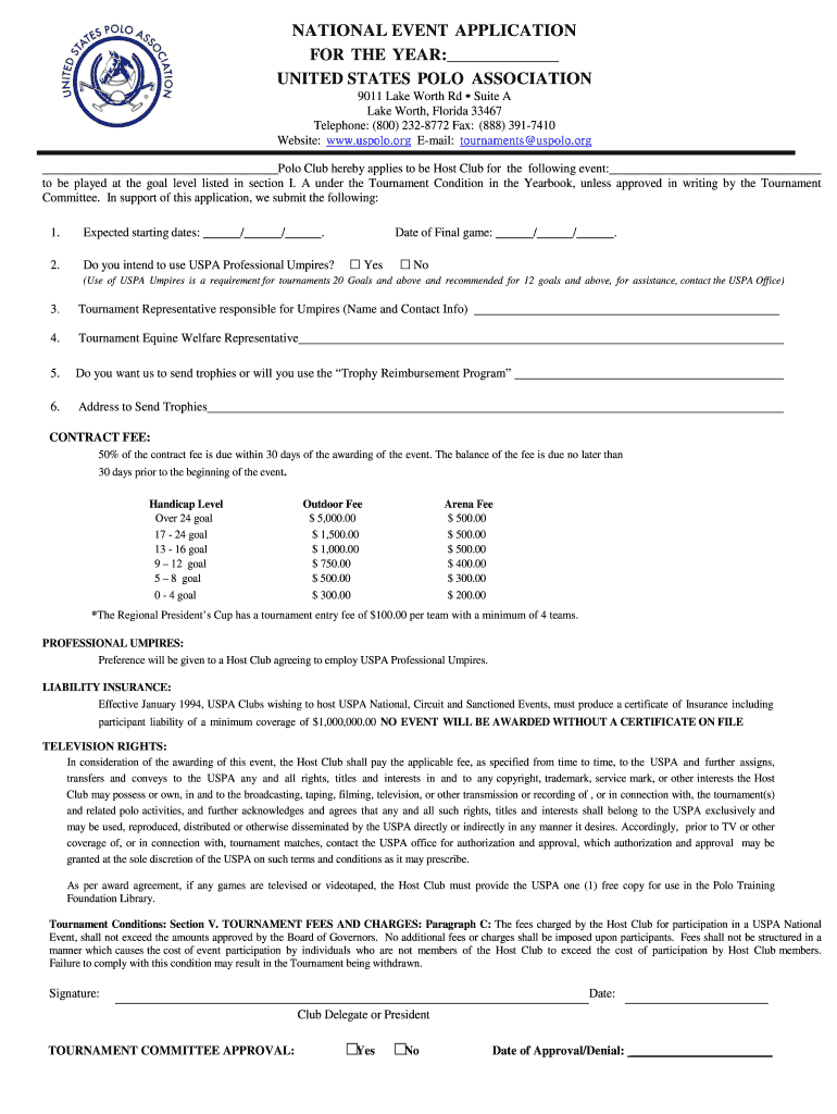 NATIONAL EVENT APPLICATION FOR THE YEAR: UNITED STATES POLO ASSOCIATION 9011 Lake Worth Rd Suite A Lake Worth, Florida 33467 Telephone: (800) 2328772 Fax: (888) 3917410 Website: www.uspolo.org Email: