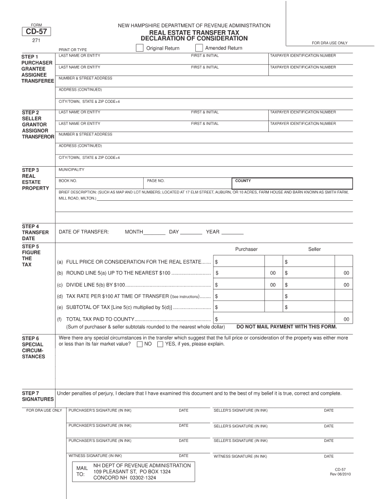 Print and Reset Form NEW HAMPSHIRE DEPARTMENT OF REVENUE ADMINISTRATION CD57 REAL ESTATE TRANSFER TAX DECLARATION OF CONSIDERATION 271 STEP 1 PURCHASER GRANTEE ASSIGNEE TRANSFEREE Original Return