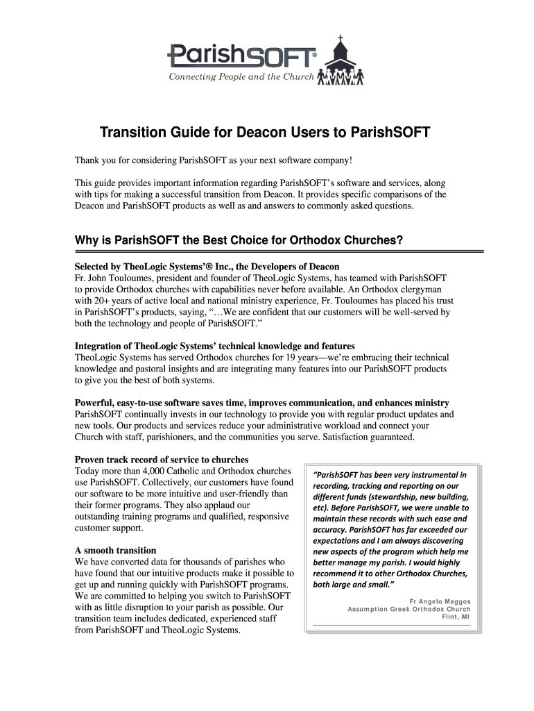 Transition Guide for Deacon Users to ParishSOFT Thank you for considering ParishSOFT as your next software company! This guide provides important information regarding ParishSOFTs software and services,