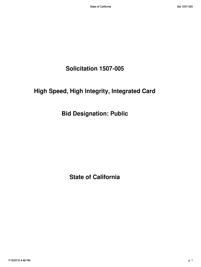 State of California Bid 1507005 5 Solicitation 1507005 High Speed, High Integrity, Integrated Card Bid Designation: Public State of California 6 7/16/2015 4:48 PM p. 1 State of California Bid 1507005