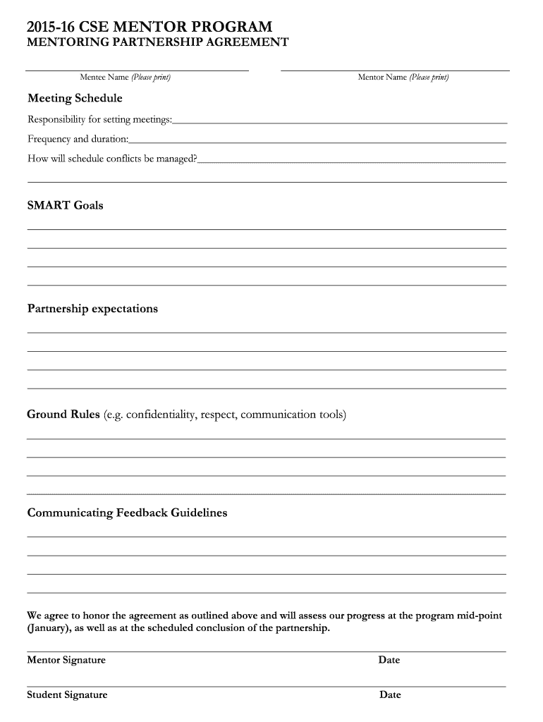 201516 CSE MENTOR PROGRAM MENTORING PARTNERSHIP AGREEMENT Mentee Name (Please print) Mentor Name (Please print) Meeting Schedule Responsibility for setting meetings: Frequency and duration: How will