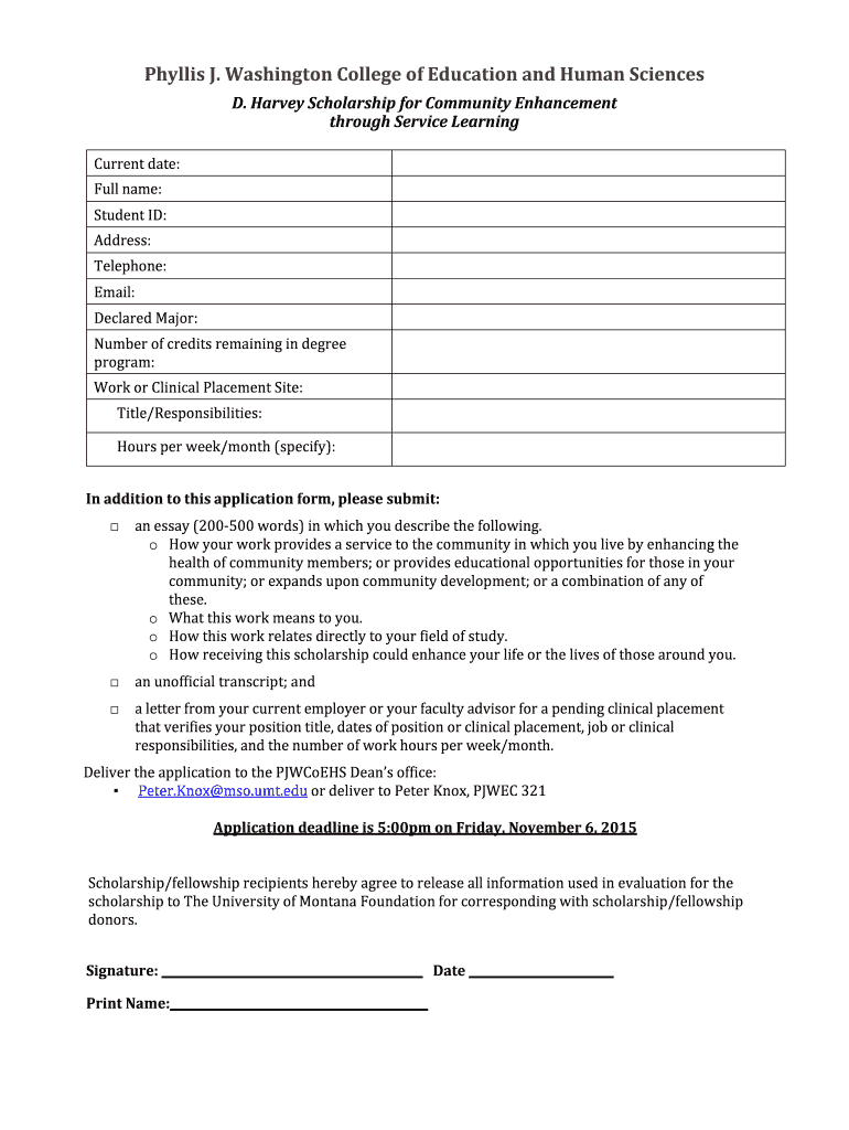 Inviting applications for the 2016 D. Harvey Scholarship for Community Enhancement through Service Learning The D. Harvey Scholarship for Community Enhancement through Service Learning is given in