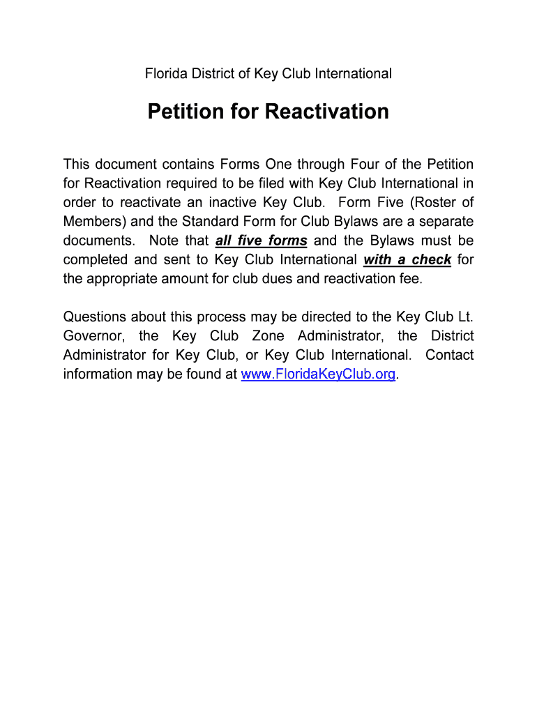 Florida District of Key Club International Petition for Reactivation This document contains Forms One through Four of the Petition for Reactivation required to be filed with Key Club International