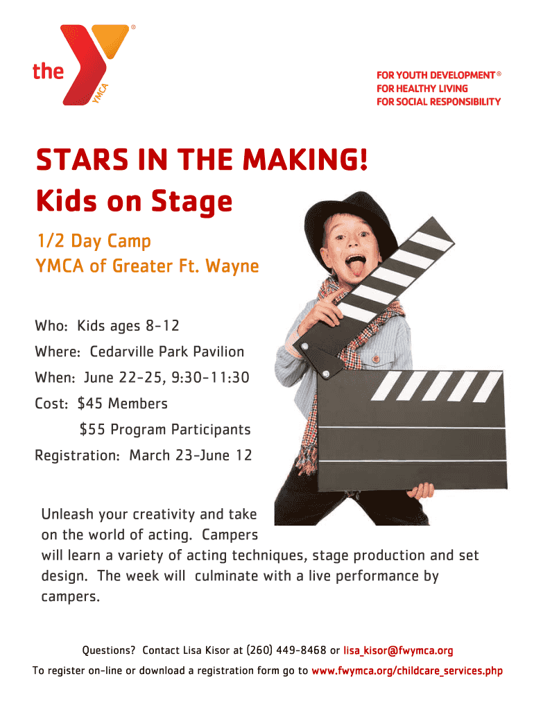STARS IN THE MAKING! Kids on Stage 1/2 Day Camp YMCA of Greater Ft. Wayne Who: Kids ages 812 Where: Danville Park Pavilion When: June 2225, 9:3011:30 Cost: $45 Members $55 Program Participants Registration:
