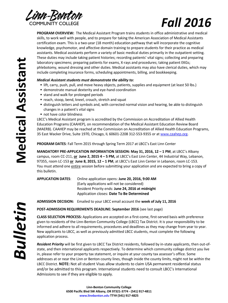 Medical Assistant Fall 2016 PROGRAM OVERVIEW: The Medical Assistant Program trains students in office administrative and medical skills, to work well with people, and to prepare for taking the American
