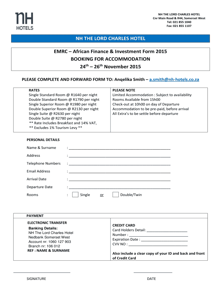 NH THE LORD CHARLES HOTEL CNR Main Road & R44, Somerset West Tel: 021 855 1040 Fax: 021 855 1107 NH THE LORD CHARLES HOTEL EMR African Finance & Investment Form 2015