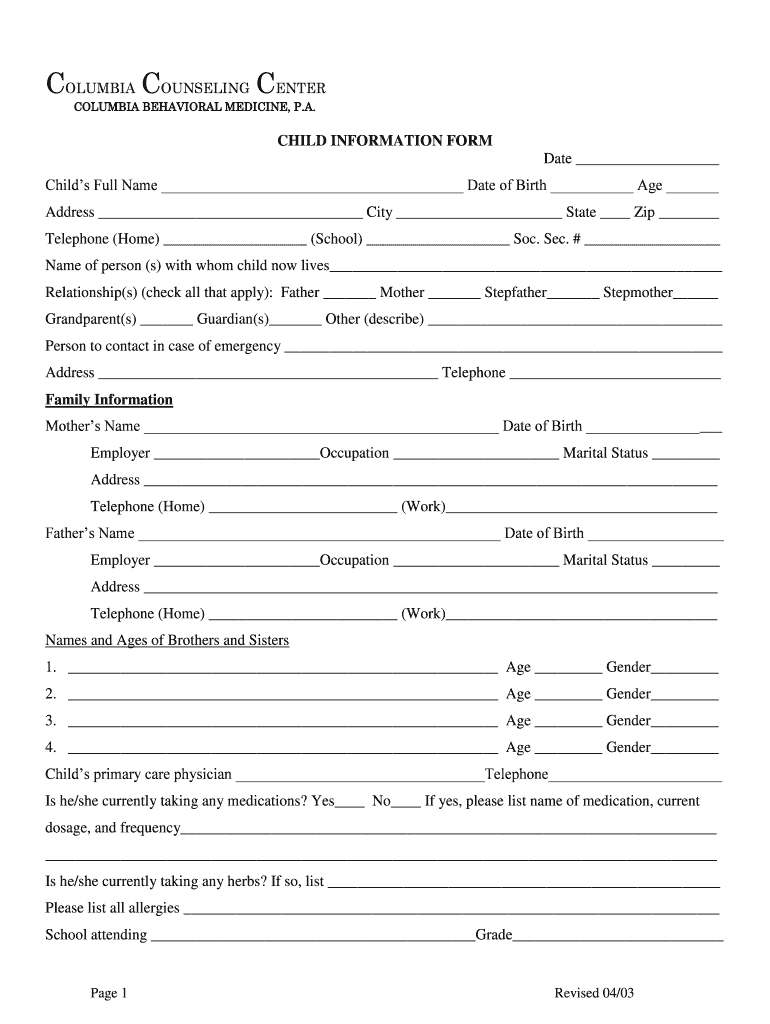 Get the free CHILD INFORMATION FORM - Columbia Counseling Center