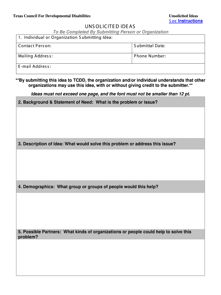 This document outlines the process for submitting unsolicited ideas to the Texas Council for Developmental Disabilities, detailing background information, instructions, and contact information for