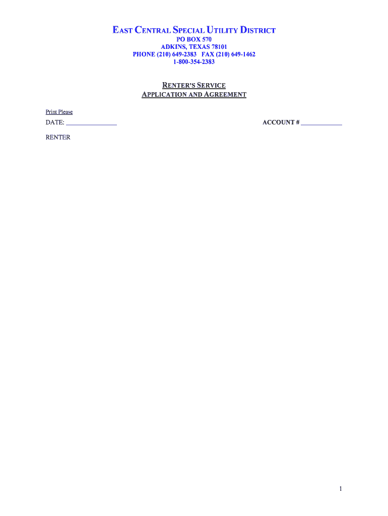 EAST CENTRAL SPECIAL UTILITY DISTRICT PO BOX 570 ADKINS, TEXAS 78101 PHONE (210) 6492383 FAX (210) 6491462 18003542383 RENTER S SERVICE APPLICATION AND AGREEMENT Print Please ACCOUNT # DATE: RENTER