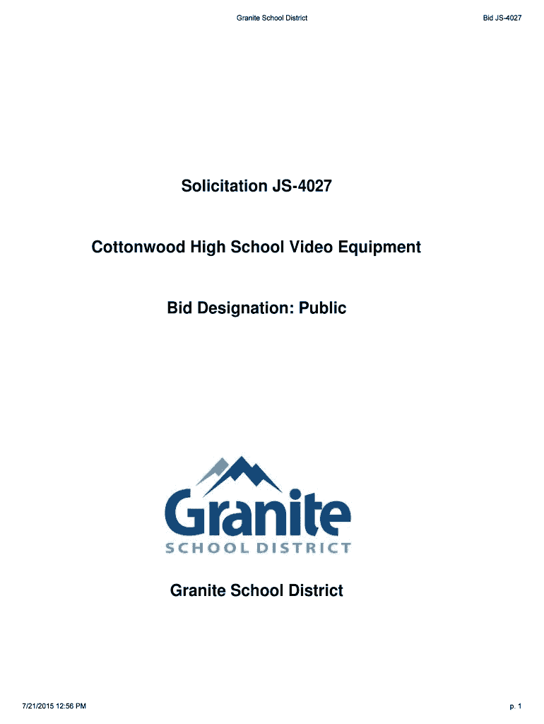 Granite School District Bid JS4027 5 Solicitation JS4027 Cottonwood High School Video Equipment Bid Designation: Public Granite School District 6 7/21/2015 12:56 PM p. 1 Granite School District Bid