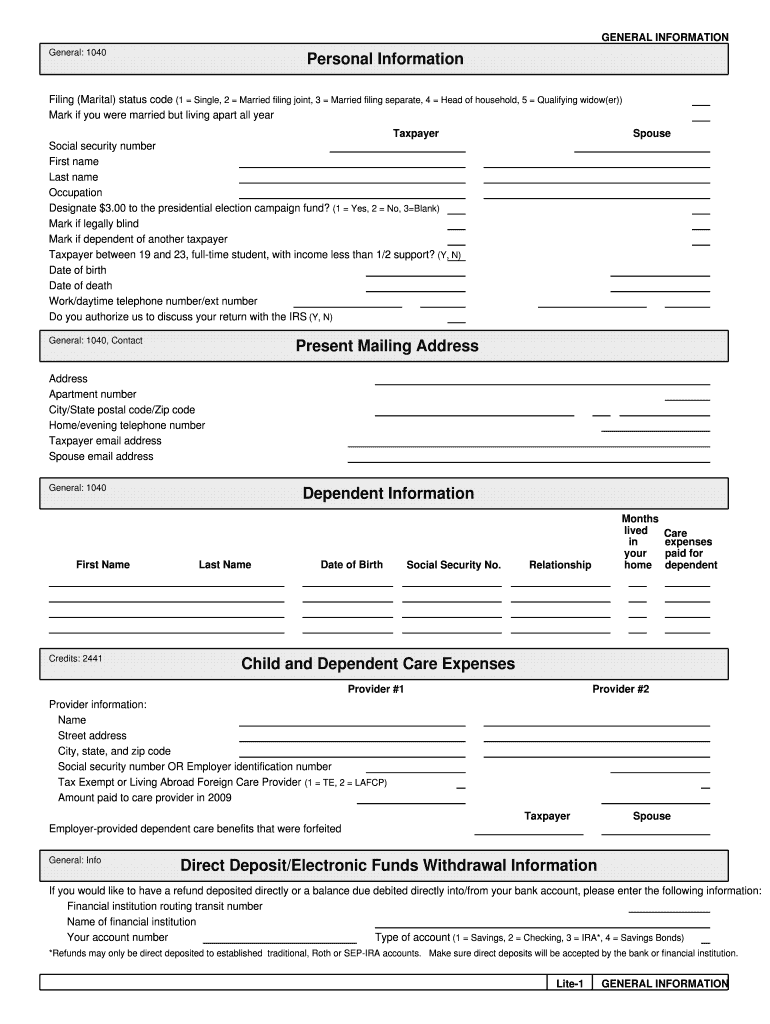 GENERAL INFORMATION General: 1040 Personal Information Filing (Marital) status code (1 Single, 2 Married filing joints, 3 Married filing separate, 4 Head of household, 5 Qualifying widow(er)) Mark