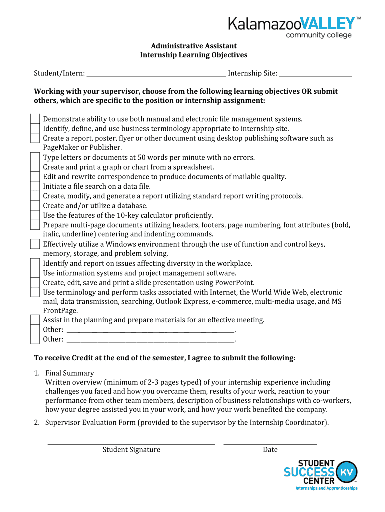 Administrative Assistant Internship Learning Objectives Student/Intern: Internship Site: Working with your supervisor, choose from the following learning objectives OR submit others, which are specific