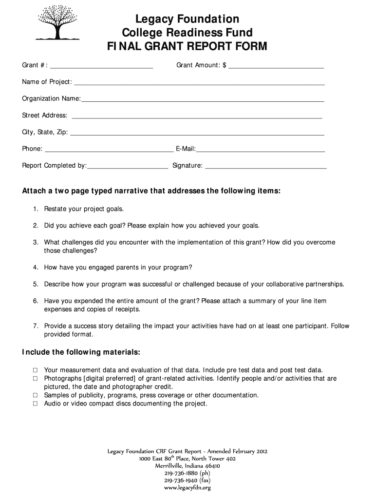 Legacy Foundation College Readiness Fund FINAL GRANT REPORT FORM Grant #: Grant Amount: $ Name of Project: Organization Name: Street Address: City, State, Zip: Phone: Email: Report Completed by: Signature: