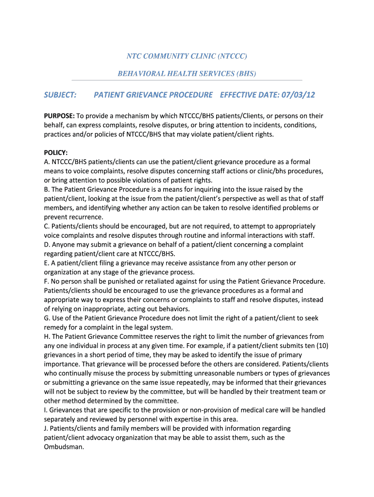 NTC COMMUNITY CLINIC (NT CCC) BEHAVIORAL HEALTH SERVICES (BHS)SUBJECT:PATIENTGRIEVANCEPROCEDURE EFFECTIVEDATE:07/03/12 PURPOSE:ToprovideamechanismbywhichNTCCC/BHS patients/Clients, orpersonsontheir