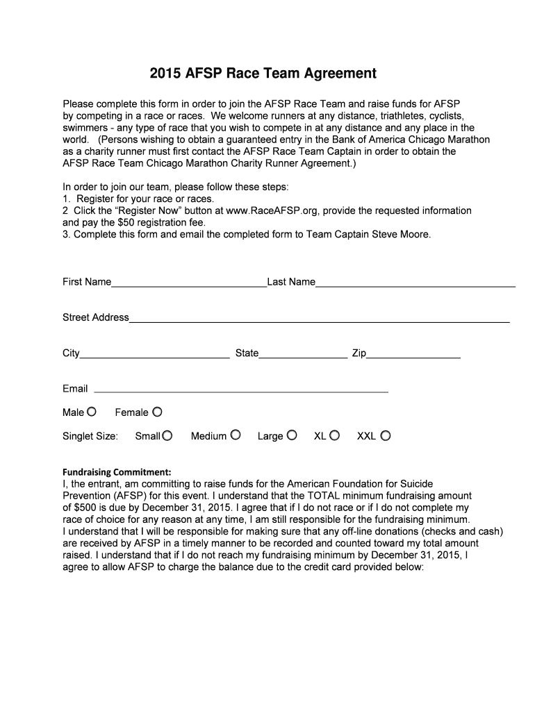 The afsp race team agreement can be filled out by providing the requested information on the agreement form and signing it.