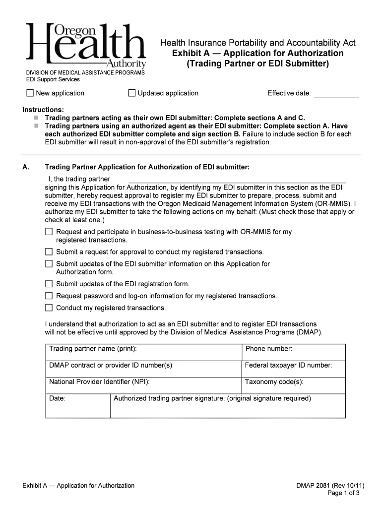 Clear Form Print Health Insurance Portability and Accountability Act Exhibit A Application for Authorization (Trading Partner or EDI Submitter) DIVISION OF MEDICAL ASSISTANCE PROGRAMS EDI Support
