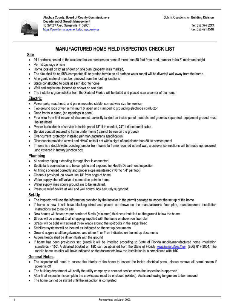 This document provides a checklist for the inspection of manufactured homes, detailing requirements for site preparation, electrical, plumbing, and general setup to ensure compliance with safety and
