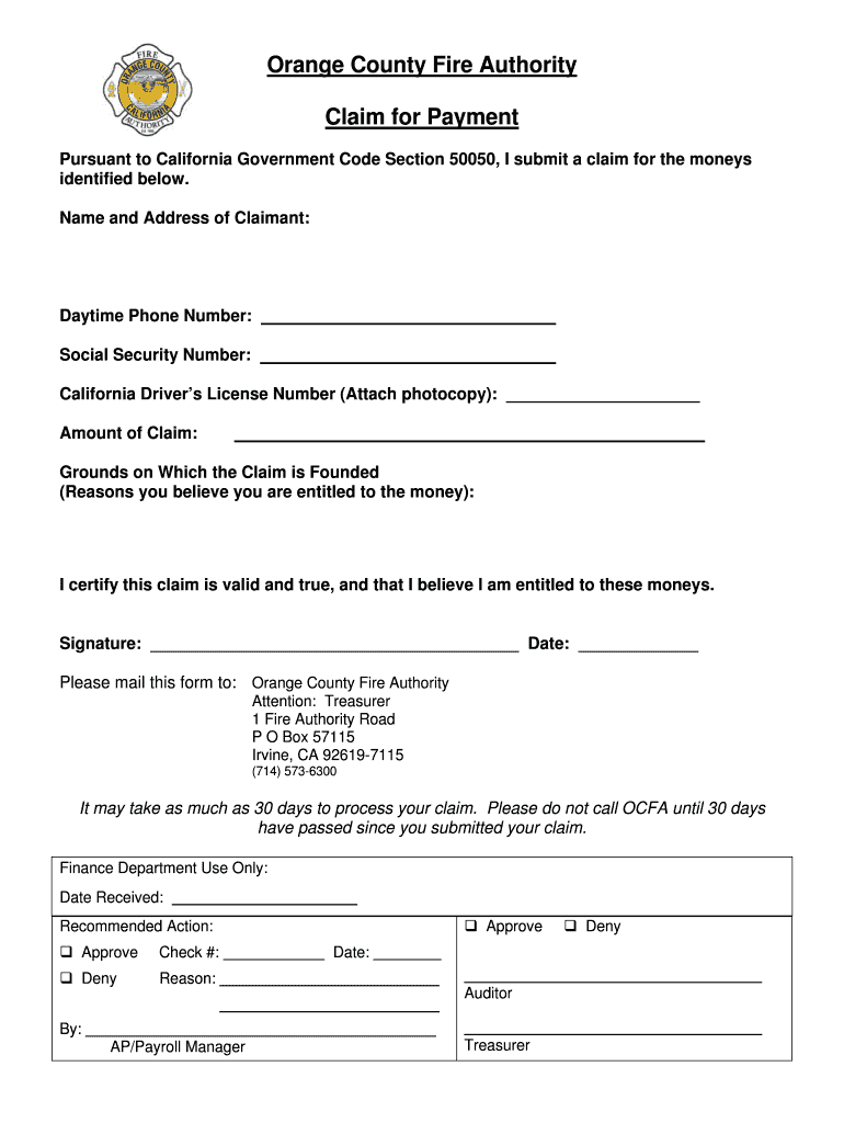 Orange County Fire Authority Claim for Payment Pursuant to California Government Code Section 50050, I submit a claim for the moneys identified below. Name and Address of Claimant: Daytime Phone Number: