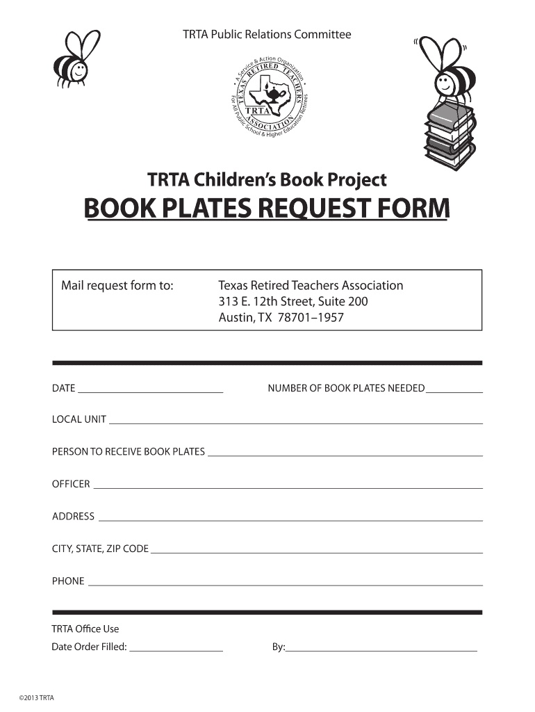 The Book Plates Request Form is a personal document used by members of the Texas Retired Teachers Association (TRTA) to request book plates for their local units.