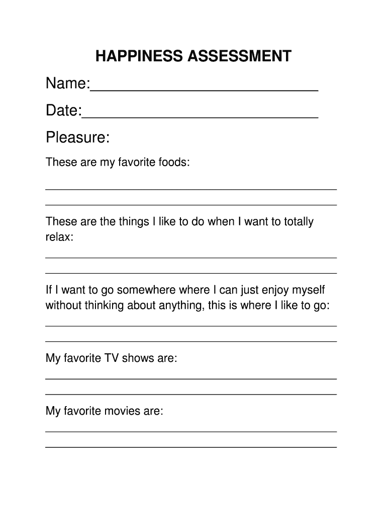 HAPPINESS ASSESSMENT Name: Date: Pleasure: These are my favorite foods: These are the things I like to do when I want to totally relax: If I want to go somewhere where I can just enjoy myself without