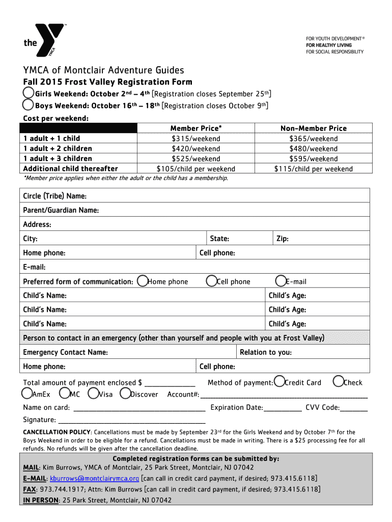 YMCA of Montclair Adventure Guides Fall 2015 Frost Valley Registration Form Girls Weekend: October 2nd 4th Registration closes September 25th Boys Weekend: October 16th 18th Registration closes October