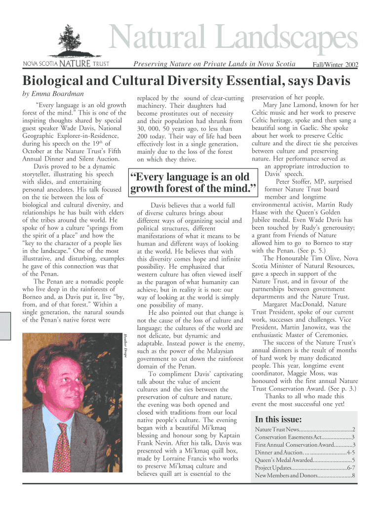 Natural Landscapes Preserving Nature on Private Lands in Nova Scotia Fall/Winter 2002 Biological and Cultural Diversity Essential, says Davis by Emma Boardman Every language is an old growth forest