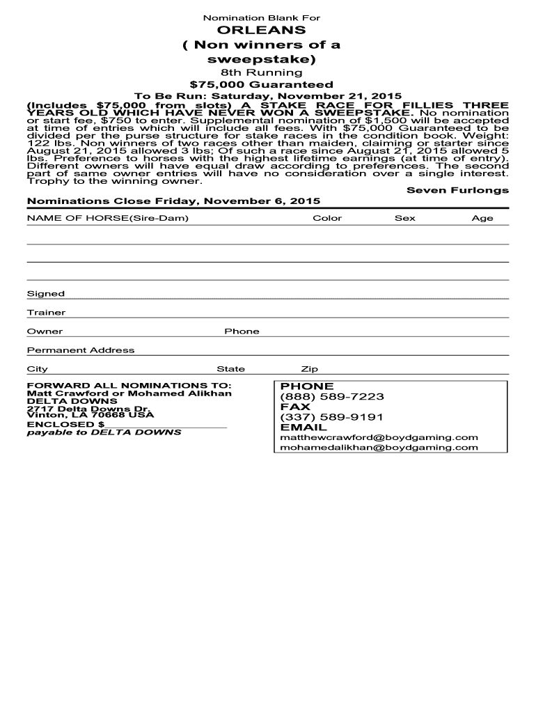 Nomination Blank For ORLEANS (Non winners of a sweepstakes) 8th Running $75,000 Guaranteed To Be Run: Saturday, November 21, 2015 (Includes $75,000 from slots) A STAKE RACE FOR FILLIES THREE YEARS