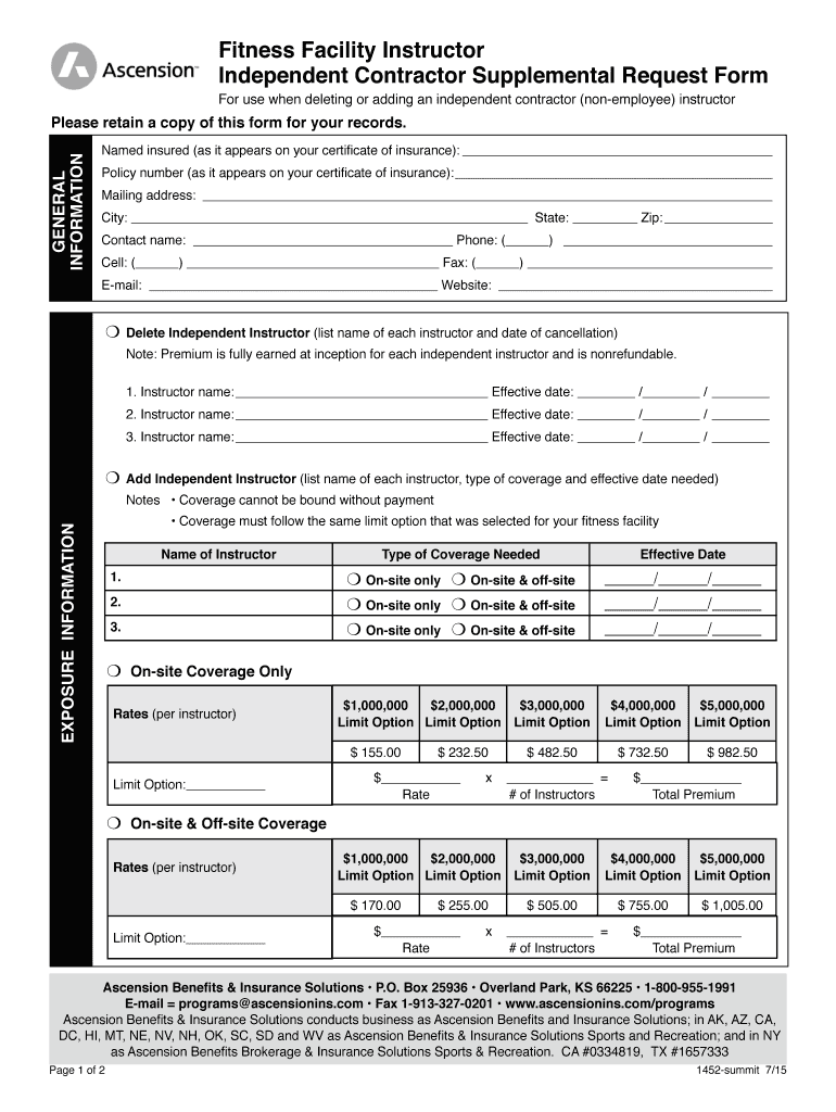 Fitness Facility Instructor Independent Contractor Supplemental Request Form For use when deleting or adding an independent contractor (non-employee) instructor GENERAL INFORMATION Please retain a