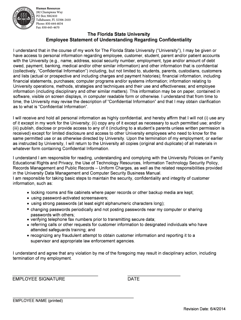 Human Resources 282 Champions Way PO Box 3062410 Tallahassee, FL 323062410 Phone: 8506446034 Fax: 8506454670 The Florida State University Employee Statement of Understanding Regarding Confidentiality