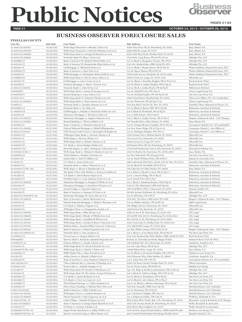 Public Notices PAGE 21 PAGES 2164 OCTOBER 23, 2015, OCTOBER 29, 2015, BUSINESS OBSERVER FORECLOSURE SALES PINELLAS COUNTY Case No. Sale Date Case Name Sale Address Firm Name 522014CA007457 10/26/2015