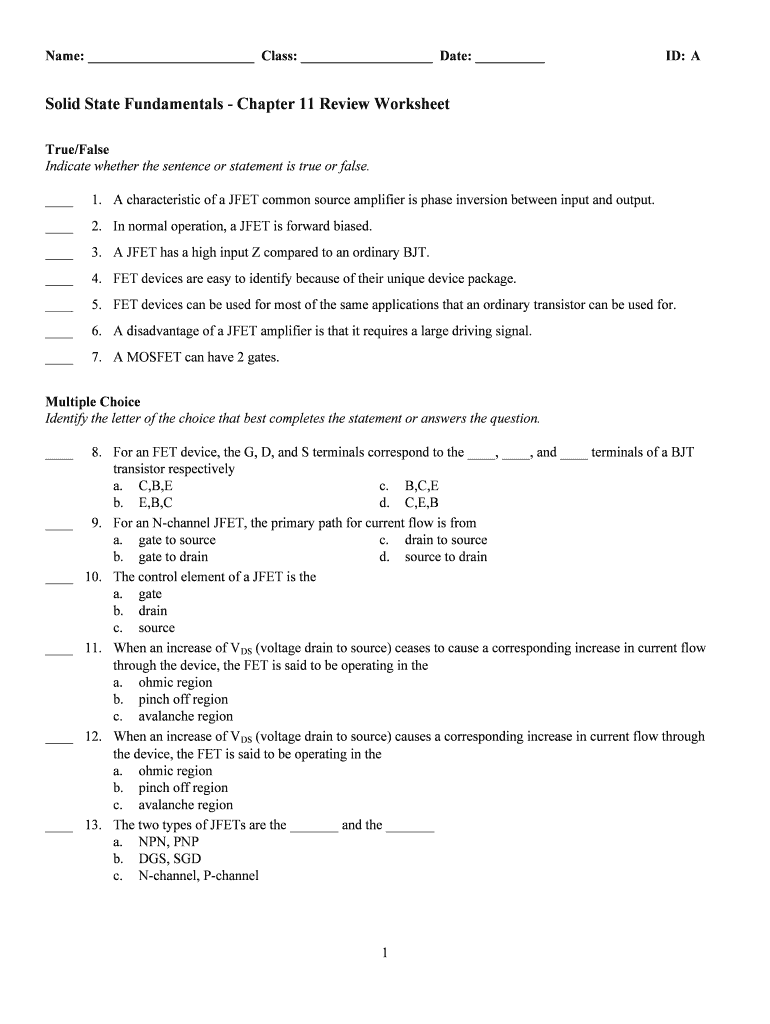 Name: Class: Date: ID: A Solid State Fundamentals Chapter 11 Review Worksheet True/False Indicate whether the sentence or statement is true or false. 1. A characteristic of a JET common source amplifier