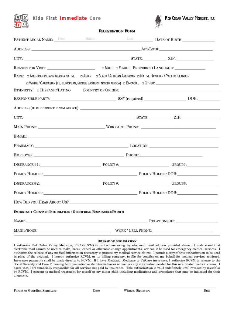 RED CEDAR VALLEY MEDICINE, PLC Kids First Immediate Care REGISTRATION FORM First Middle Last PATIENT LEGAL NAME: DATE OF BIRTH: ADDRESS: APT/LOT# CITY: STATE: ZIP: REASON FOR VISIT: RACE: AMERICAN