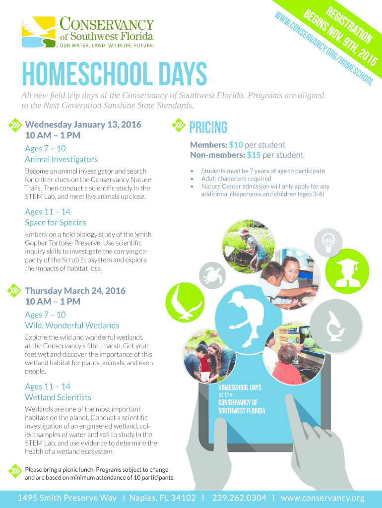 WW BEG REG INS STR AT N SER VAN OF. 9 ION TH, CY. O 201 KG/ H 5 W. C ON HOMESCHOOL DAYS OM ESC To All new field trip days at the Conservancy of Southwest Florida. Programs are aligned to the Next