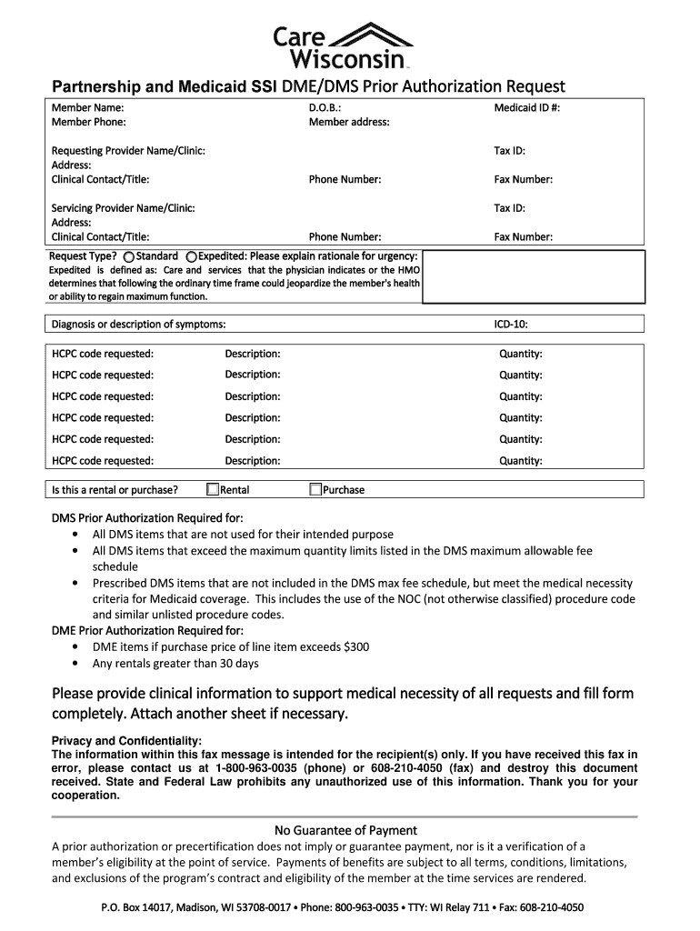 Get the free 1h - DME-DMS Prior Authorization Request Form- Draft - carewisc