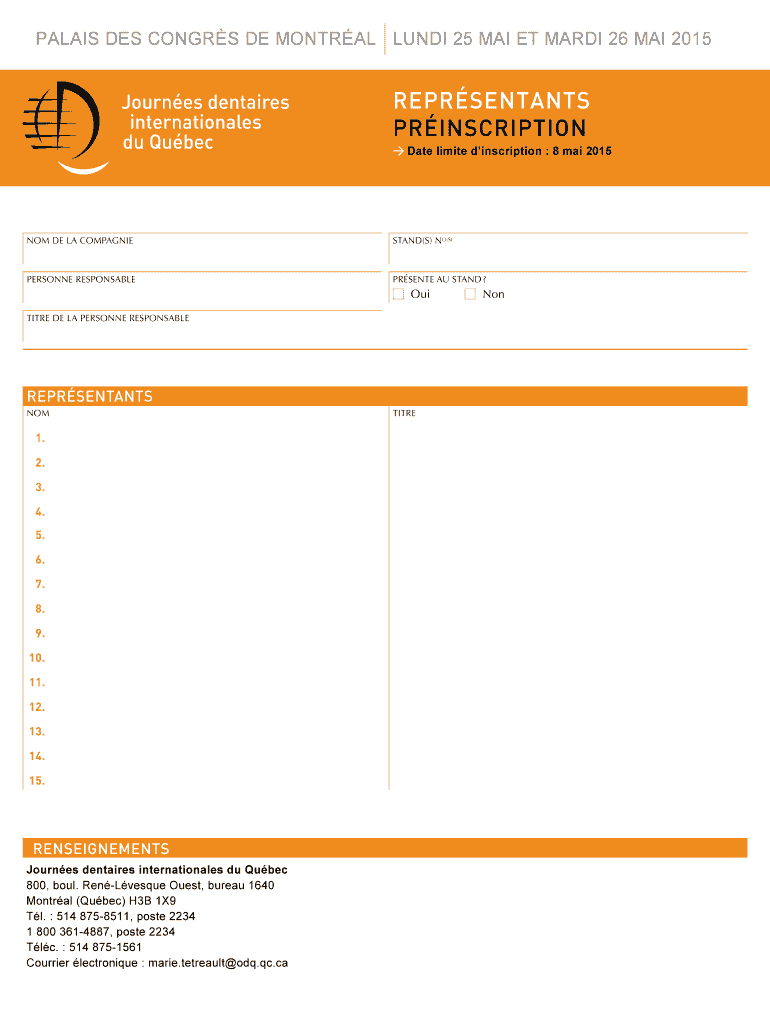 CALAIS DES CONGAS DE Montcalm LUNDY 25 MAI ET MARI 26 MAI 2015 repentant Inscription Date limited inscription : 8 Mai 2015 Not DE la companies STAND(S) NO(S) Personnel responsible PRESENT AU STAND?