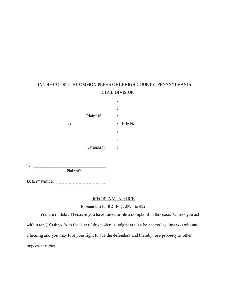 IN THE COURT OF COMMON PLEAS OF LEHIGH COUNTY, PENNSYLVANIA CIVIL DIVISION : : Plaintiff vs. : : File No. Defendant : To: Plaintiff Date of Notice: IMPORTANT NOTICE Pursuant to Pa. R.C.P. 237.1(a)(2)