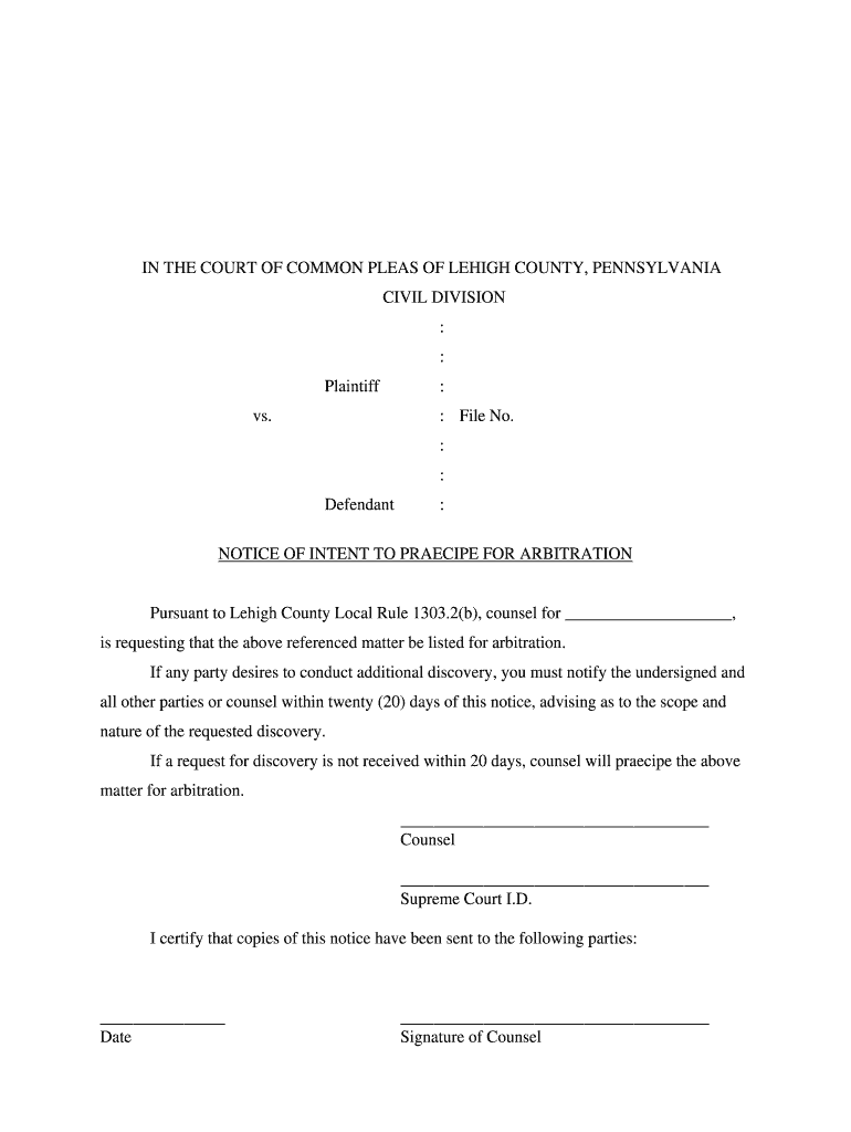 IN THE COURT OF COMMON PLEAS OF LEHIGH COUNTY, PENNSYLVANIA CIVIL DIVISION : : Plaintiff vs. : : File No. Defendant : NOTICE OF INTENT TO PRECISE FOR ARBITRATION Pursuant to Lehigh County Local Rule