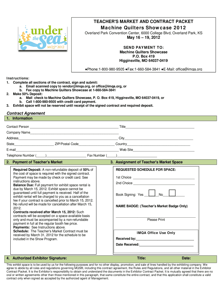 TEACHER IS MARKET AND CONTRACT PACKET Machine Quilters Showcase 2012 Overland Park Convention Center, 6000 College Blvd, Overland Park, KS May 16 19, 2012 SEND PAYMENT TO: Machine Quilters Showcase