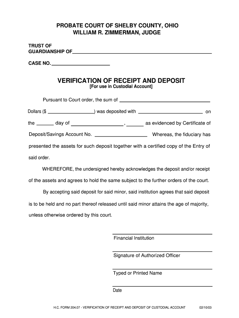 PROBATE COURT OF SHELBY COUNTY, OHIO WILLIAM R. ZIMMERMAN, JUDGE TRUST OF GUARDIANSHIP OF CASE NO. VERIFICATION OF RECEIPT AND DEPOSIT For use in Custodial Account Pursuant to Court order, the sum